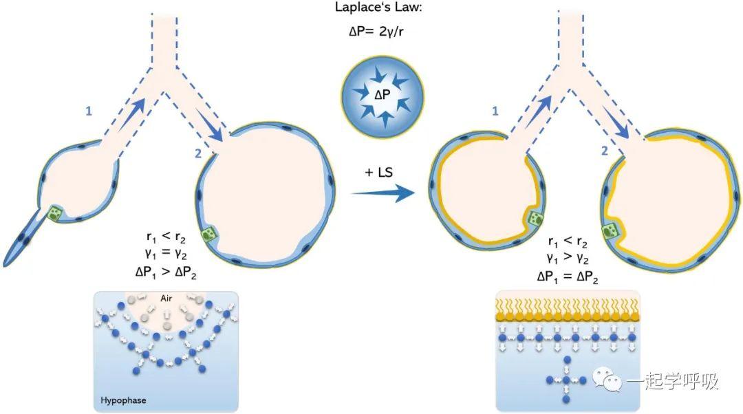 ▲肺泡Laplace定律的示意模型。理想球形肺泡的內(nèi)壓由Laplace定律定義為ΔP=2γ/r。因此,小半徑的肺泡(肺泡1)相對(duì)于大半徑的肺泡(肺泡2)具有更高的內(nèi)壓。在沒(méi)有功能性表面活性劑膜的情況下,肺泡1傾向于向肺泡2塌陷,這就允許了肺泡大小的不均勻性。然而,在表面活性劑的存在下,由于水-水-和水-空氣相之間均勻產(chǎn)生分子間力,避免了氣-液界面的彎曲并避免了肺泡塌陷,表面張力降低。LS是肺表面活性劑。