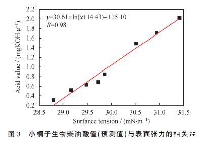 (2)通過氧化實驗得到的小桐子生物柴油的酸值與表面張力相關(guān)系數(shù)為0.99,表明可用表面張力預測酸值;比較4種預測模型的精度分析結(jié)果,確定對數(shù)模型(y=30.61x ln(x+14.43)-115.10)精度最高,其預測均方根誤差REMSP值及相關(guān)系數(shù)R分別為0.0937和0.9879,酸值預測值與真實值誤差為2.95%。