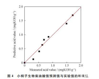 圖4為小桐子生物柴油的酸值實驗值與對數(shù)模型預測值的函數(shù)關(guān)系: