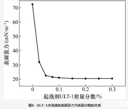 當(dāng)起泡條件相同時,起泡劑水溶液的表面張力越低,發(fā)泡體積越高。配制一系列濃度梯度的起泡劑ULT-1水溶液,利用接觸角/表面張力測量儀采用懸滴法測量表面張力與起泡劑ULT-1質(zhì)量分?jǐn)?shù)的關(guān)系,結(jié)果如圖6所示。從圖6可知:當(dāng)起泡劑ULT-1質(zhì)量分?jǐn)?shù)小于0.05%時,表面張力隨起泡劑ULT-1質(zhì)量分?jǐn)?shù)的提高快速降低;當(dāng)起泡劑ULT-1質(zhì)量分?jǐn)?shù)大于0.05%時,表面張力降幅越來越??;當(dāng)起泡劑ULT-1質(zhì)量分?jǐn)?shù)提高至0.2%時,表面張力降至20.40 mN/m,較蒸餾水降低了71.82%,繼續(xù)提高起泡劑ULT-1的質(zhì)量分?jǐn)?shù),表面張力不再降低。表明新型起泡劑ULT-1在較低濃度時即達到較低的表面張力,有利于提高發(fā)泡體積。