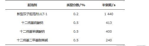 起泡性能主要是指起泡能力和泡沫穩(wěn)定性。發(fā)泡體積V0反映了起泡能力,析液半衰期t1/2反映了泡沫穩(wěn)定性。在室溫下,稱取一定質(zhì)量的起泡劑ULT-1于攪拌杯中,加入100 mL蒸餾水,置于攪拌器之上,以轉(zhuǎn)速11 000 r/min攪拌1 min。攪拌完畢后,立即取下攪拌杯,同時啟動秒表,開始記錄消泡時間,將攪拌杯中的所有物質(zhì)全部倒入1 000 mL量筒中,讀取發(fā)泡體積和從泡沫中析出50 mL液體的時間,即為半衰期。通過改變起泡劑ULT-1的質(zhì)量測量起泡性能與起泡劑質(zhì)量分?jǐn)?shù)的關(guān)系,結(jié)果如圖7所示。從圖7可知:隨起泡劑ULT-1質(zhì)量分?jǐn)?shù)的提高,發(fā)泡體積增加幅度較大,半衰期緩慢增加。當(dāng)ULT-1質(zhì)量分?jǐn)?shù)升到0.2%時,發(fā)泡體積達到501 mL,半衰期達到1 440 s,繼續(xù)提高質(zhì)量分?jǐn)?shù)發(fā)泡體積和半衰期基本不變,表明研制的新型起泡劑ULT-1低濃度時即具有較高的起泡性能,發(fā)泡體積高,泡沫半衰期長。同時,對比評價了常用起泡劑的半衰期,結(jié)果如表1所示。從表1可知:質(zhì)量分?jǐn)?shù)為0.2%的起泡劑ULT-1與質(zhì)量分?jǐn)?shù)為0.5%的常規(guī)起泡劑相比,泡沫半衰期可提高3倍以上。