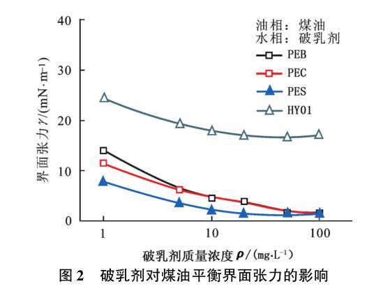 PPG是分子結構中含有疏水基團、且?guī)Р糠重撾姾傻膬捎H分子,能夠在油水界面上吸附,從而降低界面張力。實驗測得煤油的界面張力為43.5 mN·m-1,1 000 mg·L-1PPG能將其界面張力降低至26.7 mN·m-1。不同結構破乳劑對PPG-稀釋原油間界面張力的影響見圖3??梢钥闯?,1 000 mg·L-1PPG能將5%稀釋原油的界面張力降低至17.8 mN·m-1,說明原油中的活性物質(zhì)與PPG在界面上混合吸附,進一步降低了界面張力。3種聚醚類非離子破乳劑與PPG分子和原油活性組分分子發(fā)生競爭吸附,油水界面張力隨破乳劑質(zhì)量濃度增大而逐漸降低,在50 mg·L-1時達到3 mN·m-1的平臺值。從圖3還可以看出,非離子破乳劑的結構對稀釋原油的界面張力影響不大。