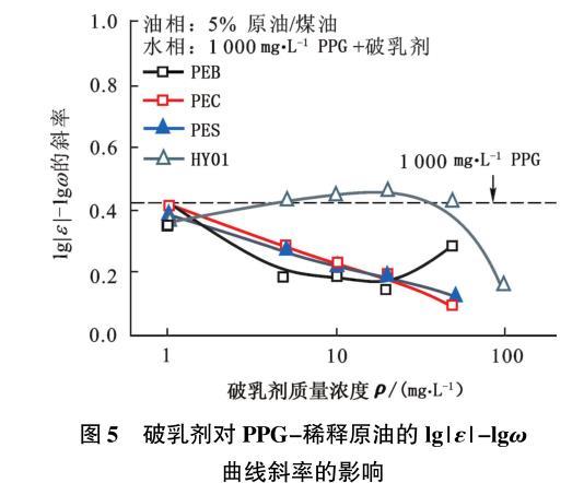 圖5破乳劑對(duì)PPG-稀釋原油的lg|ε|-lgω曲線(xiàn)斜率的影響