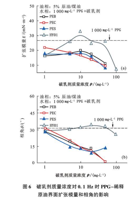 考察了固定破乳劑質(zhì)量濃度為10 mg/L時(shí),不同質(zhì)量濃度PPG-稀釋原油界面膜的擴(kuò)張流變性質(zhì),結(jié)果見(jiàn)圖8??梢钥闯?,對(duì)于不同質(zhì)量濃度的PPG界面膜,10 mg/L的3種非離子破乳劑均能大幅度降低擴(kuò)張模量,有效地破壞界面膜強(qiáng)度,星型聚合物PES對(duì)于高質(zhì)量濃度的PPG界面膜效果更佳,這與PES超強(qiáng)的頂替能力有關(guān)。對(duì)于反相破乳劑HY01,當(dāng)PPG質(zhì)量濃度較低時(shí),由于無(wú)法形成亞層結(jié)構(gòu),HY01對(duì)模量具有一定的降低效果,當(dāng)PPG質(zhì)量濃度較高時(shí),對(duì)于高模量、高強(qiáng)度的界面膜,HY01分子與PPG分子形成的界面亞層反而對(duì)模量和膜強(qiáng)度具有增效作用。PPG質(zhì)量濃度的影響趨勢(shì)也可以通過(guò)圖7所示的機(jī)制加以解釋。