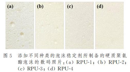 泡沫穩(wěn)定劑的存在對于硬質聚氨酯泡沫性能影響在宏觀上有著十分顯著的體現。圖5是添加不同種類的泡沫穩(wěn)定劑后制樣得到的硬質聚氨酯泡沫橫截面的數碼照片。結果表明,接枝APEG鏈段的PAVE-5和PGVF-6泡沫穩(wěn)定劑所制備的聚氨酯泡沫RPU-3和RPU-4,其泡孔結構相較于市售產品所制備的聚氨酯泡沫展現出了更加細膩均勻的泡孔結構,而市售產品所形成的泡沫則表現出較為粗糙且孔徑不均勻的泡孔結構。這表明親水結構有利于泡沫穩(wěn)定劑均勻分散在多元醇中并使得反應充分進行,泡孔尺寸細小致密,有利于改善硬質聚氨酯泡沫的壓縮性能。