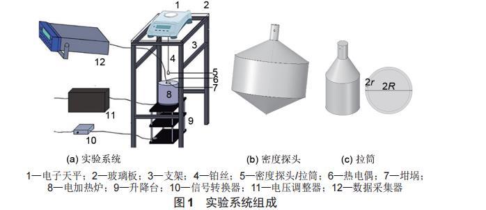 實驗系統(tǒng)由測量系統(tǒng)、加熱系統(tǒng)、控制系統(tǒng)和支撐系統(tǒng)組成。實驗系統(tǒng)如圖1(a)所示。測量系統(tǒng)由高精度電子天平(型號為METTLER TOLEDO ME104,精度為0.1 mg)、數(shù)據(jù)采集器(型號為key sight 34872 A)、熱電偶(K型)、探頭組成;加熱系統(tǒng)由電加熱爐和坩坩堝堝組成;控制系統(tǒng)由電壓調整器(型號為T6-1-4-060 DC)、智俊軟件組成;支撐系統(tǒng)由升降臺、鋼架、玻璃板組成。
