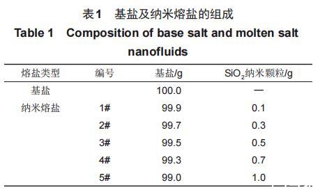本實驗所用材料為NaNO3、KNO3和30nm的SiO2納米顆粒。所有實驗材料在制備納米熔鹽之前均需要經(jīng)過干燥處理。使用型號為Mettler Toledo ME104,精度為0.1mg的電子天平對干燥后的熔融鹽和納米顆粒進行稱量。見表1,按照比例將基鹽及納米顆粒進行稱量后,利用高溫熔融法將SiO2納米顆粒均勻分散至基鹽中,將制備好的納米熔鹽樣品放入干燥箱中保存?zhèn)溆谩?
