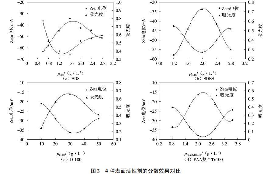圖2為pH=7的條件下,CNFs(質(zhì)量濃度0.05g/L)懸浮液的Zeta電位及吸光度隨表面活性劑濃度的變化情況.由于4種表面活性劑中,SDS與SDBS均為陰離子型表面活性劑,D-180、PAA和Tx100雖為高分子聚合物,但在分散過程中均可電離出陰離子,故懸浮液中CNFs表面的Zeta電位均為負(fù)值.從Zeta電位曲線來看,4種懸浮液的Zeta電位絕對值均隨表面活性劑濃度的增加而呈現(xiàn)先增大后減小的趨勢,期間出現(xiàn)明顯峰值.從吸光度曲線來看,4種懸浮液的吸光度曲線也隨表面活性劑濃度的增加而先增大后減小,同樣存在明顯的峰值.綜合分析2條曲線可以得出4種表面活性劑的最佳分散濃度:SDS的最佳分散濃度為1.6~g/L,SDBS的最佳分散濃度為2.0~g/L,D-180的最佳分散濃度為30 g/L,PAA復(fù)合Tx 100的最佳分散濃度為2.0~g/L.通過橫向?qū)Ρ?幅曲線圖,可以比較4種表面活性劑在各自最佳分散濃度下對CNFs的分散效果.SDS在最佳分散濃度下得到的CNFs懸浮液Zeta電位絕對值達(dá)到60 mV,吸光度達(dá)到0.80,均高于其他3種表面活性劑,說明SDS的分散性能最好,形成的CNFs懸浮液穩(wěn)定性最高.SDBS的分散效果次之,在最佳分散濃度下,CNFs懸浮液的Zeta電位絕對值為56 mV,吸光度達(dá)到0.75.再次是D-180,在其最佳濃度下,懸浮液的Zeta電位絕對值為37 mV,吸光度為0.67.分散效果最差的為PAA復(fù)合Tx100,所得的CNFs懸浮液的Zeta電位絕對值為38mV,吸光度僅為0.55.
