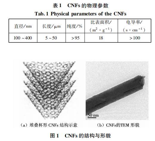 納米碳纖維(carbon nanofibers,CNFs)是近十年興起的一種新型亞微米增強(qiáng)纖維材料,它是化學(xué)氣相生長碳纖維的一種形式,一般通過裂解氣相碳?xì)浠衔镏苽?,是?gòu)成以碳黑、富勒烯、單壁和多壁碳納米管為一端,以連續(xù)碳纖維為另一端鏈節(jié)中的一環(huán).CNFs的直徑一般在150~400nm之間,與碳納米管(CNTs)相比,CNFs的制備更易于實(shí)現(xiàn)工業(yè)化生產(chǎn).CNFs有著優(yōu)異的物理性能、力學(xué)性能和化學(xué)性能.研究表明,CNFs的抗拉強(qiáng)度可以達(dá)到2~5 GPa,平均彈性模量為300 GPa.除具有普通氣相生長碳纖維的特性,如低密度、高比模量、高比強(qiáng)度、高導(dǎo)電性等性能外,CNFs還具有缺陷數(shù)量少、比表面積大、結(jié)構(gòu)致密等優(yōu)點(diǎn),這使得CNFs在納米復(fù)合材料領(lǐng)域得到了廣泛的應(yīng)用.然而,納米復(fù)合材料的性能往往會(huì)受到兩個(gè)主要因素的影響,一個(gè)是納米材料在基體材料中的分散程度,另一個(gè)是納米材料表面與基體材料之間的黏結(jié)強(qiáng)度和能量.由于受到范德華力的的影響,CNFs彼此吸引并相互纏結(jié)在一起,懸浮于水的表面,幾乎無法均勻溶解,這大大制約了CNFs在復(fù)合材料中的應(yīng)用.如何解決CNFs在水性體系中的分散已成為研究者廣泛關(guān)注的熱點(diǎn).