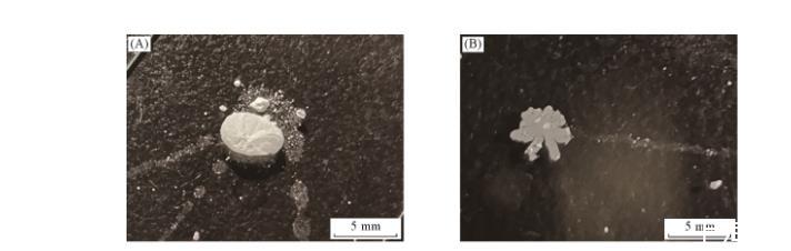 在顆粒參與形成“泡沫”過(guò)程中,存在另外一種現(xiàn)象(見圖8)。在磷酸三甲酚酯溶液中,顆粒附著在液氣表面上,有可能形成氣相為連續(xù)相、液相為非連續(xù)相的狀態(tài)[圖8(A)]。在無(wú)外力作用下,該液滴能夠保持長(zhǎng)時(shí)間穩(wěn)定。如果推動(dòng)液滴,顆粒從氣液表面脫落[圖8(B)],則液滴破碎,留下一層顆粒組成的薄膜。