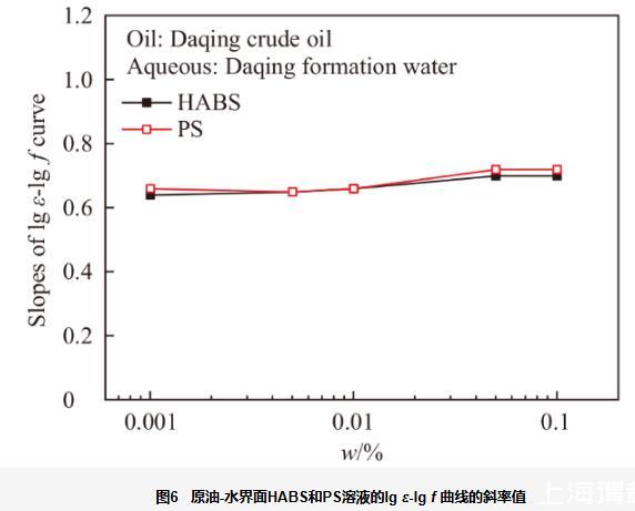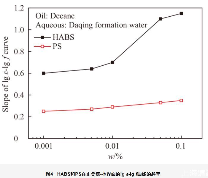 圖6原油-水界面HABS和PS溶液的lgε-lg f曲線的斜率值