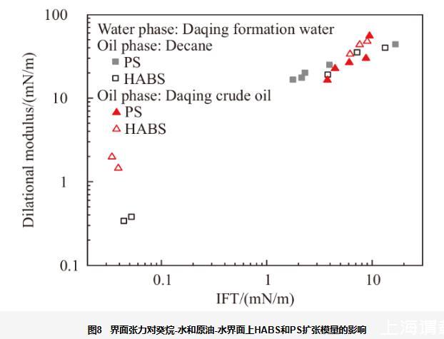 圖8界面張力對癸烷-水和原油-水界面上HABS和PS擴(kuò)張模量的影響