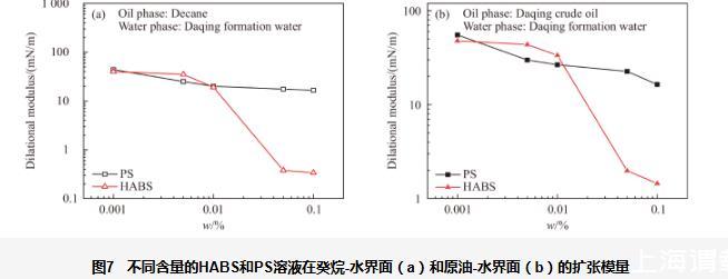 圖7不同含量的HABS和PS溶液在癸烷-水界面(a)和原油-水界面(b)的擴(kuò)張模量