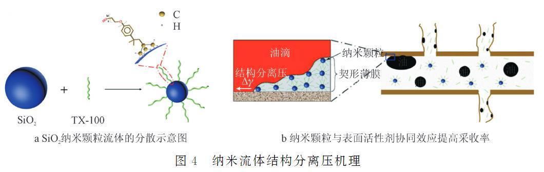 WasanD等提出的“結(jié)構(gòu)分離壓”理論,解釋了納米流體在油-固界面時這種壓力作用將油膜或油滴從巖石表面分離的過程。通過進一步的研究發(fā)現(xiàn),這種結(jié)構(gòu)分離壓力的大小和速度受到納米顆粒濃度和液滴體積的影響。ZHAO等以非離子表面活性劑(TX-100)作為分散劑和增效劑,將SiO2納米顆粒分散在水中形成SiO2納米流體(如圖4a所示),并對SiO2納米流體剝離固體表面油滴的能力進行了探究。SiO2納米流體和表面活性劑(TX-100)均具有將油滴從巖石表面脫離的能力。與表面活性劑(TX-100)相比,當添加SiO2納米顆粒時,納米流體可以在油/固體/納米流體三相接觸區(qū)形成薄膜從而產(chǎn)生結(jié)構(gòu)分離壓,將油滴從巖石表面剝離。由于表面活性劑天然剝離油滴的能力和SiO2納米顆粒的結(jié)構(gòu)分離壓力機理(如圖4b所示),SiO2納米流體具有優(yōu)秀的滲吸提高采收率能力。