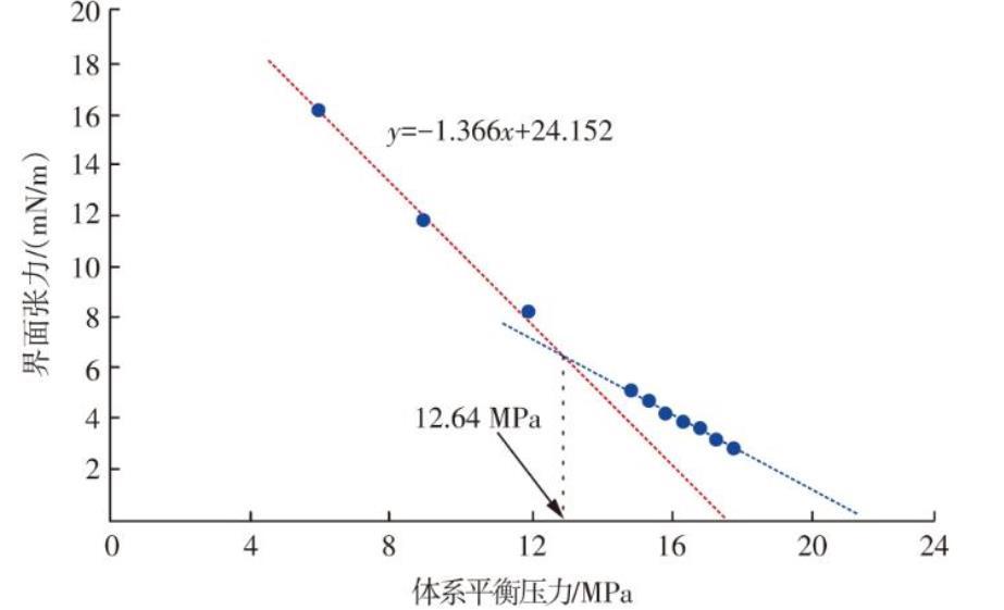 如圖2所示,懸滴法測試結(jié)果表明:當(dāng)體系平衡壓力<12.64 MPa時,界面張力隨體系平衡壓力的增大而快速減小,其線性擬合的直線與X軸交點(diǎn)位于17.56 MPa,該體系平衡壓力為多級接觸最小混相壓力;當(dāng)體系平衡壓力≥12.64 MPa時,界面張力減小幅度變緩,線性擬合的直線與X軸交點(diǎn)位于21.63 MPa,代表了CO2與原油一次接觸最小混相壓力。