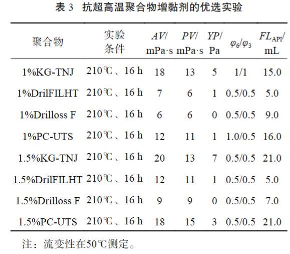 室內(nèi)對4種高溫聚合物增黏劑材料進(jìn)行了單劑抗溫性能對比評價(jià)。其中KG-TNJ為溫敏疏水締和聚合物提黏劑,DrilFILHT為納米片狀氧化鎂酚醛樹脂改性聚合物增黏降濾失劑材料,Drilloss F為納米微球聚合物復(fù)合增黏聚合物材料,PC-UTS為某國外代表性高溫聚合物材料。評價(jià)配方:基礎(chǔ)配方+2.5%KG-UTSTA+聚合物,實(shí)驗(yàn)結(jié)果見表3。