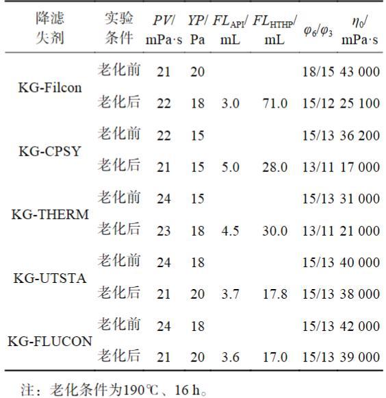 為避免超高溫下材料間的相互影響干擾判斷,室內(nèi)在190℃下先固定KG-TNJ作為增黏劑材料不變,對5種改性淀粉類高溫降濾失劑材料進(jìn)行了初選。其中,KG-Filcon為海上常用抗高溫改性淀粉;KG-CPSY和KG-THERM均為聚合物接枝改性抗高溫淀粉;KG-UTSTA和KG-FLUCON均為室內(nèi)使用2-丙烯酰胺基-2-甲基丙磺酸AMPS、聚苯乙烯乳液與可溶性淀粉在堿性條件下通過接枝共聚生成抗超高溫改性淀粉,2者區(qū)別在于KG-UTSTA為機(jī)械攪拌條件下共聚合成,KG-FLUCON為超聲波機(jī)械協(xié)同方式混勻后再進(jìn)行合成。評價(jià)配方:基礎(chǔ)配方+1.0%KG-TNJ+2.5%降濾失劑,實(shí)驗(yàn)結(jié)果見表2。由表2可知,190℃老化后,各體系的流變性能穩(wěn)定,KG-UTSTA和KG-FLUCON體系的高溫高壓降濾失性最好,濾失量小于20 mL,KG-CPSY和KG-THERM體系的高溫高壓降濾失性能次之。分析原因?yàn)楦男缘矸鄱家肓丝垢邷亟又簿蹎误w,但是KG-FLUCON、KG-UTSTA除了引入AMPS類抗高溫單體外,還引入聚苯乙烯乳液,增加了接枝改性的抗高溫基團(tuán)和空間結(jié)構(gòu),通過聚苯乙烯乳液組分的吸附、滲透、覆蓋包裹特性增強(qiáng)了對淀粉結(jié)構(gòu)的高溫保護(hù)作用和產(chǎn)物的成膜封堵性能,改善了其抗高溫性和濾失造壁。