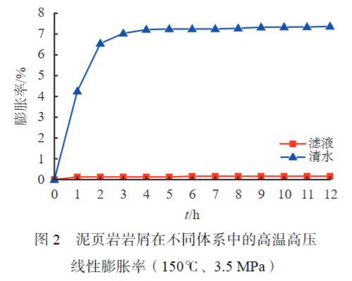 此外,目標區(qū)塊儲層段巖屑的線性膨脹率實驗結(jié)果如圖2所示。結(jié)果顯示,巖屑在清水中浸泡12 h的線性膨脹率為7.32%,在抗超高溫低滲透儲層鉆開液中浸泡的線性膨脹率為0.15%,表明該鉆開液體系抑制地層巖石水化膨脹性能效果好,有利于減少井壁巖石水化,穩(wěn)定井壁和保障井筒安全。