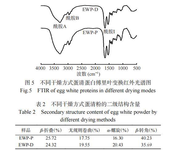 不同干燥方式蛋清蛋白的紅外光譜如圖5所示。EWP-P和EWP-D在酰胺A帶(3700~3200 cm?1)處有強吸收峰,EWP-P的峰強大于EWP-D,表明干燥方式會影響蛋清蛋白的水合能力,這可能與蛋白質分子中N-H鍵舒展并與氫鍵形成了締合體,或蛋白質分子與葡萄糖以共價鍵結合有關。酰胺B帶(2961.64 cm?1)的弱吸收峰主要由C-N鍵產(chǎn)生。酰胺I帶(1600~1700 cm?1)信號主要由C-O鍵伸縮振動引起,與蛋白質的二級結構有關,涉及β-折疊(1600~1640 cm?1)、無規(guī)則卷曲(1640~1650 cm?1)、α-螺旋(1650~1660 cm?1)和β-轉角(1660~1700 cm?1)。采用Peak fit軟件對不同干燥方式蛋清蛋白的酰胺I帶峰強進行高斯曲線擬合分析,根據(jù)峰面積計算其二級結構的相對百分含量,結果如表2。EWP-P和EWP-D的二級結構以β-折疊和β-轉角為主,EWP-P的β-折疊含量增加主要與卵轉鐵蛋白熱變性有關,同時分子間的β-折疊結構也易轉變?yōu)棣?轉角結構。而α-螺旋下降可能是因為熱變性導致α-螺旋中的氫鍵斷裂,進而發(fā)生了解螺旋現(xiàn)象。EWP-P無規(guī)則卷曲增加,表明其部分有序結構向無規(guī)則卷曲轉化,蛋白變性明顯,結構的隨機性增強。