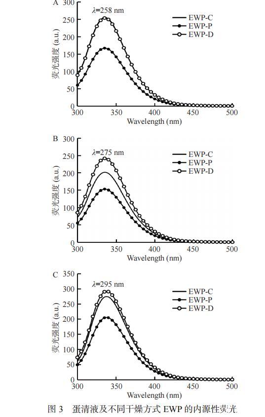 蛋白質的固有熒光來自于內部的芳香族氨基殘基(酪氨酸Tyr、色氨酸Trp、苯丙氨酸Phe),其熒光最大值(λmax)、強度對其微環(huán)境的極性極其敏感,因此可用來表征蛋白質的三級結構變化,其中Trp、Tyr和Phe的特有熒光激發(fā)波長分別為295、275和258 nm。如圖3所示,與EWP-C相比,不同干燥方式制備的蛋清粉的固有熒光強度降低但熒光峰的位置未有明顯的遷移。EWP-P的熒光強度低于EWP-D于EWP-C,可能是因為噴霧干燥的干燥溫度高,蛋清蛋白變性程度大,芳香族氨基酸殘基暴露于更極性環(huán)境中,進而發(fā)生了熒光猝滅現(xiàn)象。此外,EWP-P的熒光強度較低還可能是由于蛋清蛋白中含有葡萄糖,在高溫下會與蛋白質發(fā)生美拉德反應,屏蔽了芳香族氨基殘基。