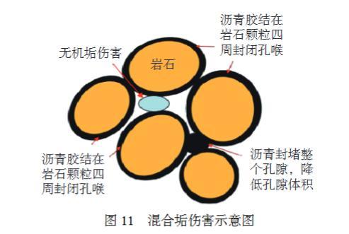 通過觀察傷害后巖心表面,可以發(fā)現(xiàn)瀝青在孔隙系統(tǒng)中的分布模式如圖11所示。對于孔隙系統(tǒng)來說,瀝青膠結(jié)在巖石顆粒四周,這類瀝青可能對減小孔隙體積作用不明顯,但其可以顯著限制或封閉孔喉,導(dǎo)致滲透率下降;另一種充填在孔隙內(nèi),堵塞整個孔隙,降低孔隙體積。儲層中的瀝青占據(jù)儲層的部分儲集空間,破壞儲層孔隙結(jié)構(gòu),不僅會減小儲層的孔隙度,同時還會大幅度減低儲層滲透率,嚴(yán)重影響儲層物性及油氣井產(chǎn)能。