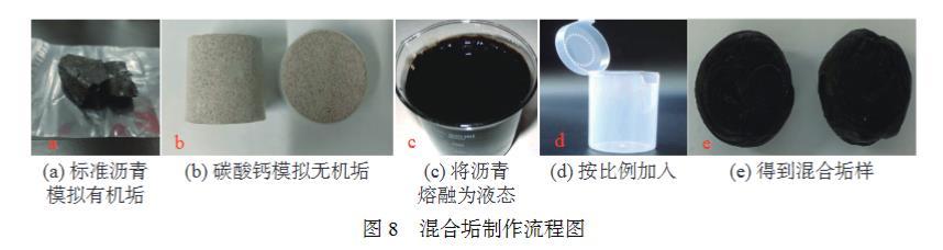 采用瀝青塊模擬有機(jī)垢,碳酸鈣(灰?guī)r)模擬無機(jī)垢,瀝青和碳酸鈣3∶7混合物模擬混合垢?;旌瞎笜又谱鞑襟E如下:①將瀝青塊敲成小塊放入燒杯;②控溫磁力攪拌器將瀝青融化為液態(tài);③將液態(tài)瀝青趁熱導(dǎo)入塑料試管中;④再按比例加入碳酸鈣,在瀝青凝固前攪拌均勻;⑤得到比表面積接近混合垢(瀝青碳酸鈣質(zhì)量比為3∶7),混合垢制作流程圖見圖8。