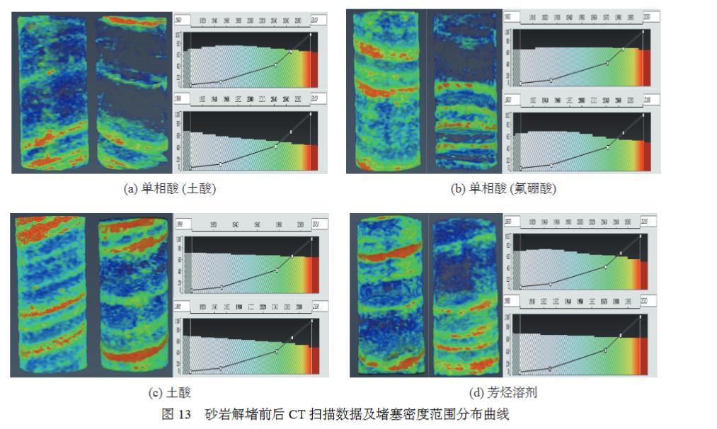 對混合垢傷害解堵前后的巖心進(jìn)行CT掃描,見圖13。對CT掃描圖像數(shù)據(jù)密度分布進(jìn)行處理,紅色區(qū)域為以無機(jī)質(zhì)為主的高密度堵塞區(qū)域,藍(lán)色范圍為有機(jī)質(zhì)為主的低密度堵塞區(qū)域,圖中可見單相酸(土酸)傷害解除范圍最大,對高密度的礦物溶蝕性能更好。土酸、芳烴溶劑單獨處理效果差。也可從堵塞物CT密度分布曲線得出相同結(jié)論(其中,密度分布曲線中橫坐標(biāo)代表密度數(shù),按照空氣為0,水為1000進(jìn)行校正;縱坐標(biāo)為歸一化密度累計占比,對應(yīng)曲線為混合垢傷害前巖石密度分布,作為參照。密度分布曲線中彩色區(qū)域代表不同密度下CT響應(yīng)強(qiáng)度),土酸解除了高密度范圍的堵塞,但低密度堵塞沒有解除;芳烴溶劑解除了低密度范圍堵塞,但高密度堵塞沒有解除,而單相酸體系均有解除。