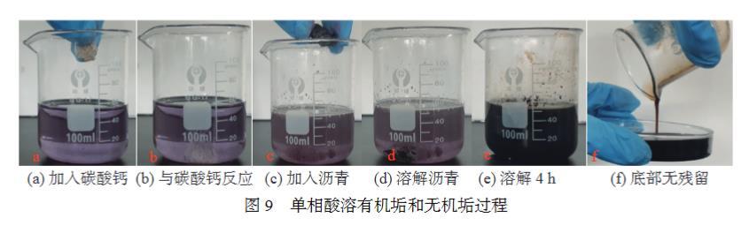 分別對鹽酸、芳烴溶劑、單相酸溶解有機(jī)垢、無機(jī)垢及其混合垢性能進(jìn)行測試。實驗條件:90℃水浴,50 g溶液,2.5 g垢樣,溶解4 h,實驗結(jié)果見表2。從表2可以看出,單相酸對混合垢溶解效率遠(yuǎn)高于單一解堵體系,具備同時解除有機(jī)垢、無機(jī)垢及其混合垢的能力。單相酸溶有機(jī)垢和無機(jī)垢過程圖片見圖9,當(dāng)碳酸鈣加入后,單相酸與碳酸鈣反應(yīng)較明顯;當(dāng)瀝青加入后,常溫下溶解較慢,90℃水浴4 h后完全溶解;溶解后的殘液倒出后,燒杯底部無殘留,表明單相酸可以完全溶解有機(jī)垢(碳酸鈣)和無機(jī)垢(瀝青)。