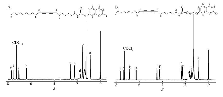 2類香豆素取代二乙炔單體參照文獻(xiàn)所述方法合成,分子結(jié)構(gòu)及產(chǎn)物核磁譜圖如圖1所示。將2種產(chǎn)物分別溶于氯仿,配成1mg/mL的溶液。亞相為超純水(18.2MΩ·cm)。所有的π-A曲線和LB膜拉制實(shí)驗(yàn)均為20℃條件下在KSV Mini-trough LB膜儀上進(jìn)行。溶劑充分揮發(fā)后,膜障以5 mm/min的速率對(duì)其壓縮,在20℃和恒定膜壓35 mN/m下以2mm/min速率沉積Y-型LB膜。基片為石英片。薄膜的聚合是在16W的紫外燈(波長(zhǎng)254nm)輻照下完成的,薄膜表面距離燈管下緣10cm,輻照時(shí)間5min。