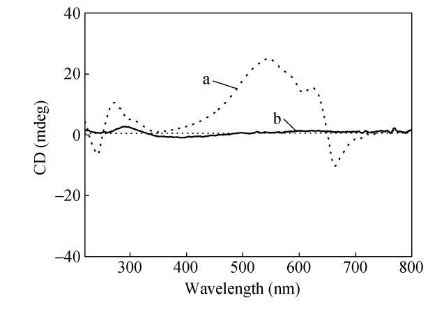 香豆素基團(tuán)在紫外光照條件下可發(fā)生可逆的光二聚反應(yīng):在365nm光輻照下,香豆素基團(tuán)能發(fā)生光二聚反應(yīng),在254nm輻照下香豆素二聚體能可逆地發(fā)生解二聚反應(yīng)??梢灶A(yù)見(jiàn)香豆素端基的二聚化將影響香豆素取代二乙炔單體在氣液界面的組裝,從而影響聚二乙炔主鏈螺旋結(jié)構(gòu)的形成。我們用365nm紫外燈輻照CODA氯仿溶液20min,此時(shí)香豆素端基能發(fā)生二聚,而二乙炔基團(tuán)不會(huì)發(fā)生聚合。將得到的CODA二聚體的氯仿溶液鋪展在水面上,沉積制備LB膜,制備得到的CODA二聚體LB膜能聚合成藍(lán)相。CD光譜測(cè)試發(fā)現(xiàn)香豆素基團(tuán)和相應(yīng)的聚二乙炔吸收帶均出現(xiàn)了明顯的CD信號(hào),但強(qiáng)度較CODA LB膜均有所減弱,如圖8所示。