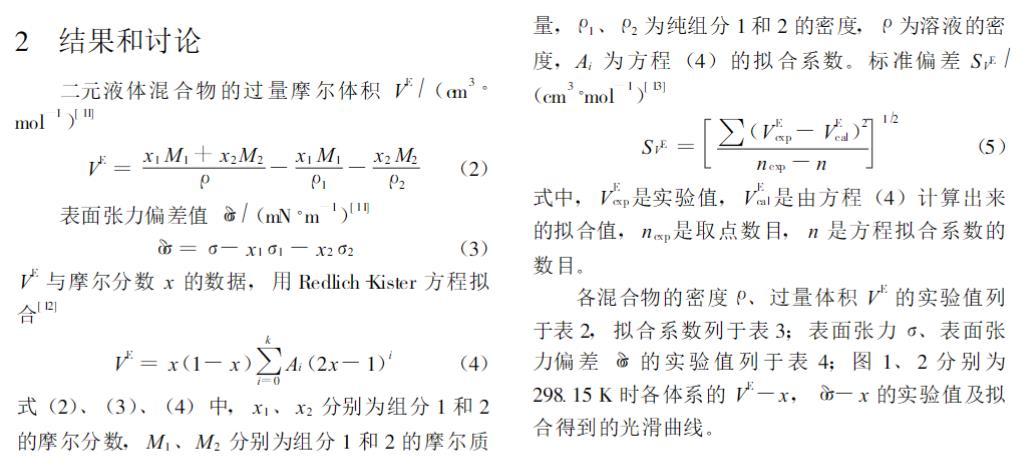 式 (2)、 (3)、 (4)中, x1、 x2分別為組分1 和2的摩爾分?jǐn)?shù), M1、 M2分別為組分1 和2 的摩爾質(zhì)量, ρ1、 ρ2為純組分1 和2 的密度, ρ為溶液的密度, Ai為方程 (4)的擬合系數(shù)。標(biāo)準(zhǔn)偏差 SVE(cm3·mol-1)[ 13]