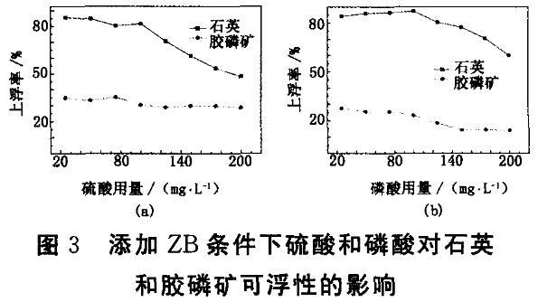 此外使用ZB和硫酸及ZB和磷酸組合的復(fù)配藥劑作為調(diào)整劑進(jìn)行試驗(yàn),控制ZB用量為150 mg/L,分別考察添加不同用量的硫酸和磷酸對(duì)石英和膠磷礦可浮性的影響,結(jié)果見圖3。