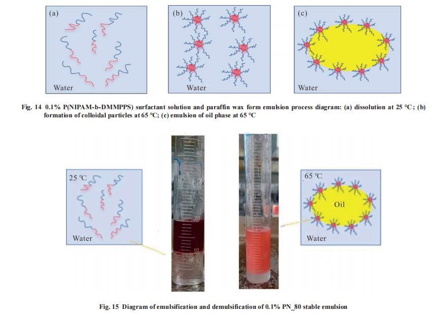 Fig.14展示了P(NIPAM-b-DMMPPS)形成乳液的機(jī)理圖,在25°C時(shí),P(NIPAM-b-DMMPPS)雙嵌段聚合物的PNIPAM鏈段和PDMMPPS鏈段都處于親水狀態(tài)并且舒展開(kāi)來(lái),使得其能夠溶解在水中。因?yàn)樵谶@個(gè)溫度時(shí),PNIPAM鏈段的酰胺基與水分子之間形成了氫鍵,表現(xiàn)出親水性,而PDMMPPS鏈段親水性強(qiáng),能與水分子相互作用,使整個(gè)聚合物分子充分溶解。當(dāng)溫度升高到65°C時(shí),PNIPAM鏈段的氫鍵在高溫時(shí)被破壞,導(dǎo)致其變得疏水并發(fā)生收縮;與此同時(shí),PDMMPPS鏈段依然保持親水性并舒展開(kāi)來(lái)。這種不同的溫度響應(yīng)性質(zhì)使得P(NIPAM-b-DMMPPS)聚合物在水溶液中形成了以疏水的PNIPAM為核,親水的PDMMPPS為殼的微米級(jí)球狀膠體顆粒。在這種結(jié)構(gòu)形態(tài)下,當(dāng)表面活性劑(即這種雙嵌段聚合物)與油混合并進(jìn)行乳化時(shí),疏水的PNIPAM核可以與油相容,而親水的PDMMPPS殼則可以與水相容,從而穩(wěn)定地分散在連續(xù)水相中。這樣,就形成了穩(wěn)定的乳液。