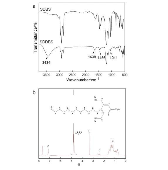 界面潤濕性調(diào)控驅(qū)油劑SDDBS的合成示意圖如圖1所示.通過紅外光譜和核磁共振氫譜對合成原料十二烷基苯磺酸鈉(SDBS)和最終產(chǎn)物二羥甲基十二烷基苯磺酸鈉(SDDBS)進行結(jié)構(gòu)表征.由圖2a可見,位于1456和1638 cm-1的特征峰證明了苯環(huán)的存在,3434 cm-1處寬峰為O―H的伸縮振動峰,通過對比SDBS和SDDBS的紅外光譜,可以判斷SDDBS中含有羥基基團.由圖2b可得,δ4.8為D2O溶劑峰;δ0.6~1.49為亞甲基上的質(zhì)子峰(a);δ2.32~2.60的三重峰為甲基上的質(zhì)子峰(d);δ3.35為羥基上的質(zhì)子峰(b);δ7.14為芳烴特征峰(c).通過1H NMR確定了最終產(chǎn)物中羥基等基團的存在及位置.紅外光譜和核磁共振氫譜結(jié)果表明目標產(chǎn)物SDDBS合成成功,結(jié)構(gòu)準確.