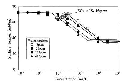 雖然表面張力不是毒性的絕對因素,但表面活性劑的急性水生毒性與表面活性劑的界面活性密切相關(guān)。 已有報道表明:水硬度對幾種表面活性劑的水生毒性的影響,以及無機(jī)鹽對某些表面活性劑溶液表面張力的影響。 然而,還沒有研究將這三個因素聯(lián)系起來。 因此,我們試圖通過改變水的硬度來闡明表面活性劑溶液的表面張力與水生毒性之間的關(guān)系。
