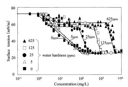 肥皂和礦物成分結(jié)合形成不溶性絡(luò)合物,因此使用硬水的肥皂溶液的表面張力不穩(wěn)定。 因此,重復(fù)進(jìn)行表面張力測量,以獲得圖7中的表面張力曲線。 當(dāng)存在硬度組分時,皂的表面張力曲線分四個階段變化。 最初,隨著皂液濃度的增加,皂液的表面張力略有下降。 在第二階段,表面張力值保持不變。 在第三階段,隨著肥皂濃度的增加,表面張力再次降低,直到cmc,在最后階段,表面張力再次趨于恒定。 在第一和第二階段,在透明液體中觀察到肥皂浮渣。 在第三階段,也觀察到肥皂浮渣,但透明液體變?yōu)榉稚⒁后w。 在最后階段,肥皂浮渣消失,觀察到分散液體。