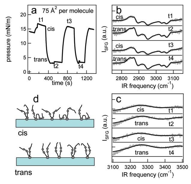 圖4。 (a) 在每分子面積為75?2的脂質/H2O界面處,作為光開關脂質時間函數(shù)的表面壓力。 用370和450 nm光照射 ~ 100秒分別產生順式(高壓)和反式(低壓)狀態(tài)。 壓力的微小劇烈波動是由于樣品高度的變化,以校正水的蒸發(fā)。 (b和c)CH和OH區(qū)域(灰色)中相應的VSFG光譜以及洛倫茲線形狀模型的擬合(見正文)。 為了清晰起見,光譜已被抵消。 t1至t4對應于面板a中獲取光譜的時間。 (d) 脂質尾部方向的示意圖。 光開關脂質的偶氮苯部分用灰色圓圈表示。