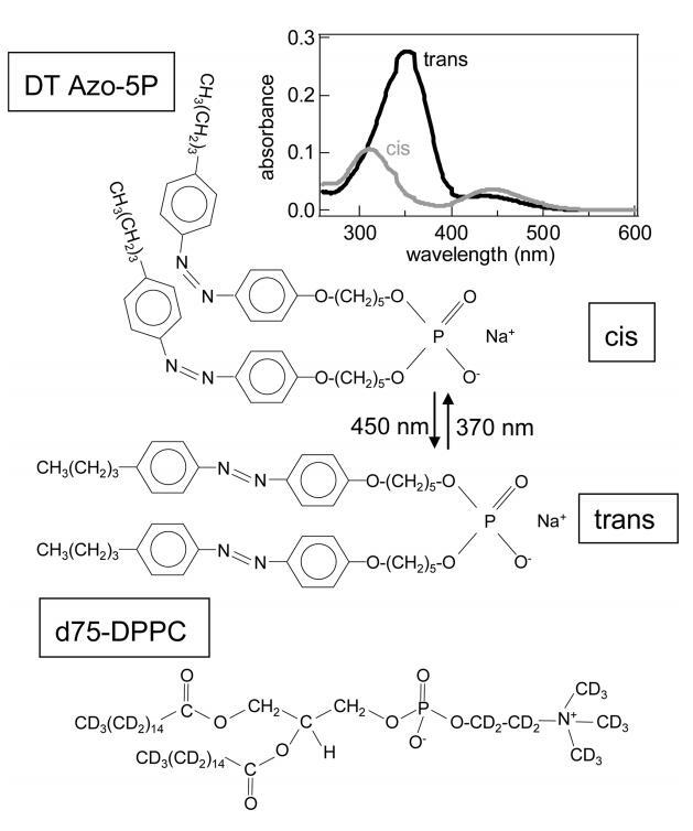 圖1。 順式和反式構型的光開關脂質DT Azo-5P和d75 DPPC的分子結構。 右上角的插圖顯示了CHCl3中DT Azo-5P的紫外/可見光譜( ~ 在370nm(順式狀態(tài))和450nm(反式狀態(tài))下輻照約10s后,使用7μM,1cm的反應杯。