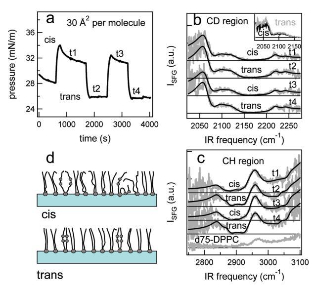 圖7。在脂質/H2O界面處,DT Azo-5P/d75 DPPC的1:5混合物的結果,每個分子的面積為30?2。(a) 表面壓力與時間的關系。用370和450 nm光照射~100秒分別產生順式(高壓)和反式(低壓)狀態(tài)。壓力的微小劇烈波動是由于樣品高度的變化,以校正水的蒸發(fā)。順式狀態(tài)下表面壓力的降低可能是由于單層的松弛或膠束或囊泡的形成減少了表面脂質的數(shù)量。(b) 相應的VSFG光譜(灰色)以及CD區(qū)域的擬合。為了清晰起見,光譜已被抵消。插圖顯示了相互重疊的反式和順式光譜,以強調差異。(c) VSFG光譜(灰色)以及用于引導眼睛進入CH區(qū)域的擬合。底部曲線顯示了在P時純d75 DPPC的光譜~ 40百萬/米。(d) 脂質尾部方向的示意圖。光開關脂質的偶氮苯部分用灰色圓圈表示。