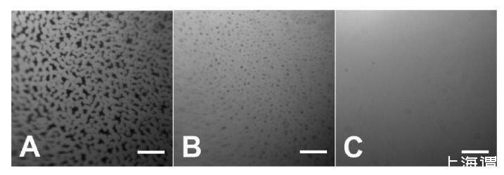 圖3。顯示異質(zhì)結(jié)構(gòu)域轉(zhuǎn)變?yōu)橥|(zhì)層的熒光圖像。C(HSA-TR)=PBS中的0.01 mg/mL,pH值7.2,離子強度=530 mM。(A)3、(B)8和(C)將蛋白質(zhì)溶液引入試驗箱后36分鐘。標尺:50μm。