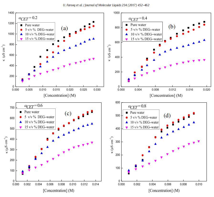 圖4。cmc的變化(■)在298.15 K條件下,在不同體積百分比的二甘醇-水混合物(a)存在于純水中(b)5 v/v%二甘醇-水(c)10 v/v%二甘醇-水和(d)15 v/v%二甘醇-水中時(shí),使用αCET的cmc*()。