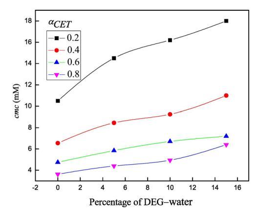 表1列出了根據(jù)式(3)計(jì)算的純水中的β值。在存在不同體積百分比的二甘醇-水二元溶液的情況下,也測(cè)定了類似值,如表1所示。β的值可以是正(拮抗作用)、負(fù)(協(xié)同作用)或零(組分之間無(wú)相互作用)[51]。此外,β的負(fù)值意味著IL和表面活性劑之間的吸引力大于單個(gè)組分之間的吸引力。從表1可以看出,對(duì)于所有二元混合物,β值均為負(fù)值,然而,隨著DEG的量從5增加到15 v/v%,負(fù)值減小,令人驚訝的是,對(duì)于αCET=0.2和0.4,β值均為正值。β的負(fù)值通常是混合膠束中有利相互作用的原因,然而正值意味著不利相互作用[53–54]。因此,從表1中可以看出,作為膠束形成主要力量的協(xié)同作用隨著DEG量的增加而減少。這種下降的原因可能是DEG的結(jié)構(gòu)破壞能力導(dǎo)致單體之間的疏水相互作用減少,從而降低了它們的協(xié)同作用。
