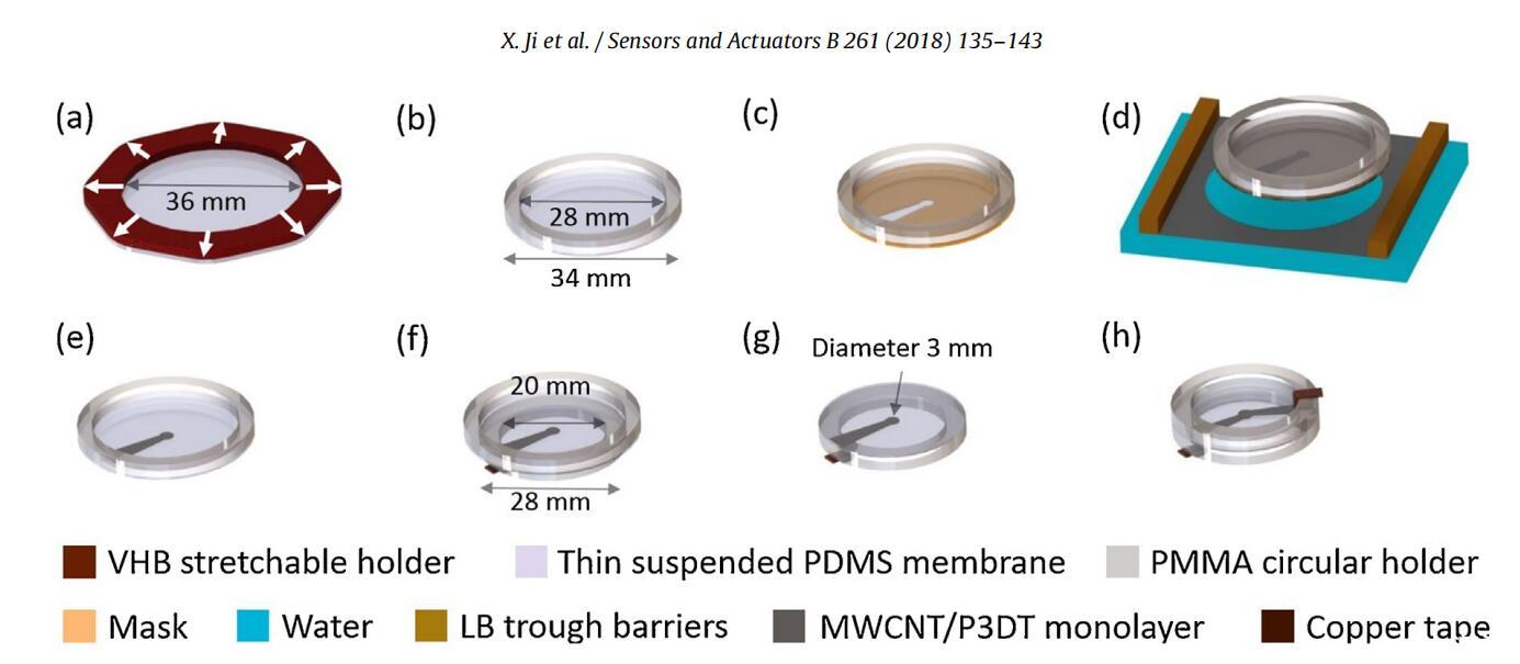 圖2。采用LS技術(shù)制備1.4μm厚DEA的工藝。(a)懸浮式PDM(Sylgard 186)等雙軸預(yù)拉伸(初始厚度:2.0μm,拉伸后:1.4μm)。(b)懸浮拉伸1.4μm厚的PDMS膜,固定在PMMA支架上。(c)在懸浮膜上放置一個(gè)面罩。(d)在空氣-水界面形成的單層電極在帶有掩膜的懸浮PDMS膜上的LS轉(zhuǎn)移。(e)PDMS上的圖案化單層電極。(f)將覆蓋有圖案化單層電極的PDMS膜轉(zhuǎn)移到較小的PMMA支架上。(g)圖案化單層電極位于PDMS的下側(cè),電極與銅帶連接,PDMS的上側(cè)不帶電極。(h)采用LS電極技術(shù)制造DEA。