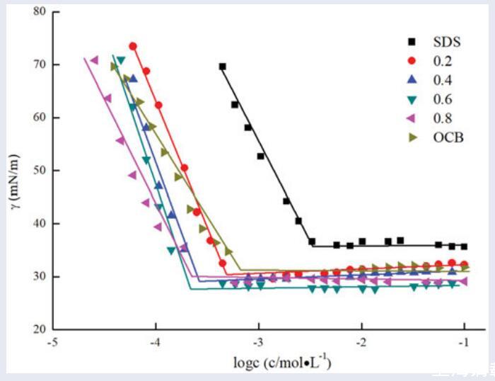 在這項工作中,我們以橄欖油、橄欖油羧基甜菜堿(OCB)和橄欖油磺基甜菜堿(OSB)為基礎(chǔ)合成了羧基甜菜堿和磺基甜菜堿表面活性劑。通過FT-IR和ESI-MS對其結(jié)構(gòu)進行了表征。為了討論合成的兩性表面活性劑在兩性狀態(tài)下的協(xié)同效應(yīng),測量了它們的等電點(pI)以揭示在不同pH值下水溶液中的電荷狀態(tài)。然后在一定的等電點上進行了表面性質(zhì)和協(xié)同作用的實驗。考察了十二烷基苯磺酸鈉(SDBS)制備的表面活性劑在整個摩爾分數(shù)范圍內(nèi)的臨界膠束濃度(CMC)、表面張力(γCMC)和其他表面活性參數(shù)。使用Clint方程分析了CMC與CMCid的偏差,以描述兩性離子/陰離子表面活性劑系統(tǒng)的非理想混合行為。根據(jù)規(guī)則溶液理論,評估了混合膠束中的膠束組成(X1m)和相互作用(βm),該理論已用于解釋許多二元表面活性劑系統(tǒng)的非理想行為。研究了無機鹽金屬離子NaCl和MgCl2的不同價態(tài)對OCB/SDBS和OSB/SDBS體系表面活性的影響。