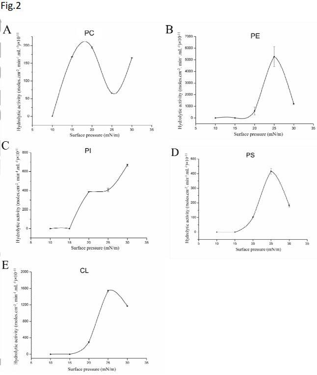圖2示出了使用各種磷脂作為水解底物獲得的詳細(xì)活性-表面壓力曲線??梢钥闯觯傅乃饣钚愿叨纫蕾囉诒砻鎵毫?。然而,每種底物的活性曲線不同。發(fā)現(xiàn)基板PE、PS和CL的鐘形曲線具有特征性的最佳表面壓力值(圖2B、D、E)。在低于15 mN/m的表面壓力下,未檢測(cè)到基本酶活性。水解活性隨表面壓力的增加而增加。在25 mN/m的表面壓力下,觀察到PE、PS和CL的最大活性。然而,當(dāng)表面壓力高于25 mN/m時(shí),所有這些磷脂的水解活性降低。與所有測(cè)試的底物相比,在25 mN/m的表面壓力下,PE的水解率最高,水解活性達(dá)到5272.31×10-11摩爾。cm-2。最小-1。mL-1。對(duì)于PI,在15 mN/m以下也沒有觀察到水解速率,但是,沒有觀察到鐘形曲線,并且隨著表面壓力從15 mN/m增加到30 mN/m,活性增強(qiáng)(圖2C)。對(duì)于PC,從10 mN/m到25 mN/m觀察到鐘形曲線,但在30 mN/m的表面壓力下,活性進(jìn)一步增加。隨著表面壓力從25 mN/m增加到30 mN/m,表面輪廓上的單層構(gòu)象可能發(fā)生了變化,導(dǎo)致活性增加。在本實(shí)驗(yàn)中,在測(cè)試的表面壓力范圍內(nèi),SM沒有活性。從π-A曲線可以看出,在25 mN/m的表面壓力下測(cè)試的所有磷脂都處于液態(tài)冷凝狀態(tài),沒有達(dá)到各自的坍塌壓力。在這種情況下,超卵磷脂酶對(duì)不同單分子磷脂膜的偏好順序?yàn)镻E>CL>PS>PI>PC。在這些條件下,SM沒有活性。Lecitase Ultra選擇性的詳細(xì)機(jī)制仍需闡明。
