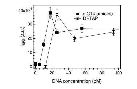 隨著DNA濃度的增加,有五個(gè)因素可能會(huì)導(dǎo)致OD拉伸光譜響應(yīng)的變化。(i)由于脂質(zhì)與聚陰離子DNA的相互作用,DC界面場可能會(huì)發(fā)生變化(其中初始場是帶電脂質(zhì)頭基(DPTAP和diC14氨基)和兩性離子頭基(DPPC)偶極子的結(jié)果,伴隨DNA吸附的場變化預(yù)計(jì)只會(huì)調(diào)制光譜振幅)。(ii)新結(jié)構(gòu)類型的水(與新受體或供體氫鍵的水)的產(chǎn)生,預(yù)計(jì)會(huì)改變OD拉伸中心頻率和線型,并且其他類型界面水的密度保持不變,導(dǎo)致光譜振幅增加。(iii)被吸附的DNA可以置換界面水,導(dǎo)致界面水分子數(shù)量減少(如果DNA置換所有“類型”的水的程度相同,這種置換只會(huì)導(dǎo)致光譜振幅降低)。(iv)DNA的吸附可能會(huì)產(chǎn)生額外的非中心對(duì)稱區(qū)域(即,脂質(zhì)-水界面可能會(huì)改變?yōu)橹|(zhì)-水-DNA-水界面)。如果吸附在DNA螺旋另一側(cè)的水分子發(fā)生破壞性干擾,這將導(dǎo)致光譜振幅降低。(v)吸附的DNA可能會(huì)導(dǎo)致界面水分子重新定向,從而使它們的OD拉伸振幅(在我們的實(shí)驗(yàn)幾何中很明顯)顯著降低。