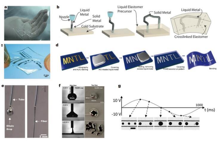 除了某些特定材料的表面(金、銅、錫等)可以潤濕外,使用施加電壓等方法也可以改變液態(tài)金屬的潤濕特性,使其在基材表面擴(kuò)散,在此基礎(chǔ)上可以制造出可拉伸的電子設(shè)備。