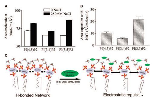 為了確定PIP2特異性膨脹是否主要由大塊肌醇環(huán)引起,同時控制?;溄M成,用磷脂酰肌醇4-磷酸(LR PI(4)P)和磷脂酰肌醇(LR PI)重復(fù)壓力面積等溫線。由于這些分子是細胞中酶促PIP2生成的前體,它們的脂肪酸組成與PIP2相似或相同,只是在肌醇環(huán)上的磷酸取代程度不同。與PIP2一樣,兩種肌醇基脂質(zhì)均未觀察到相變,平均分子面積隨著磷酸取代度的增加而增加,與之前的觀察結(jié)果一致。29然而,盡管單磷酸鹽PI(4)P與二磷酸鹽PIP2表現(xiàn)出相同的趨勢,但PI和PI(4)P均未表現(xiàn)出對NaCl濃度增加的顯著擴張,表明類似但小得多的影響(圖2b)。這些數(shù)據(jù)表明,NaCl誘導(dǎo)PIP2單分子膜擴張的機制與其他陰離子以及其他肌醇基脂質(zhì)相比,是PIP2特有的。