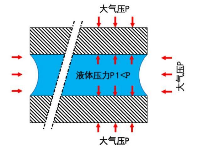 簡言之,上面的圖稍微有點(diǎn)錯(cuò)誤:水和大氣的界面不是平的,而應(yīng)該是一個(gè)凹液面。而恰恰是這個(gè)凹液面,導(dǎo)致了完全不同的結(jié)果。具體講,就是使得液體內(nèi)部的壓力低于外部的大氣壓力。