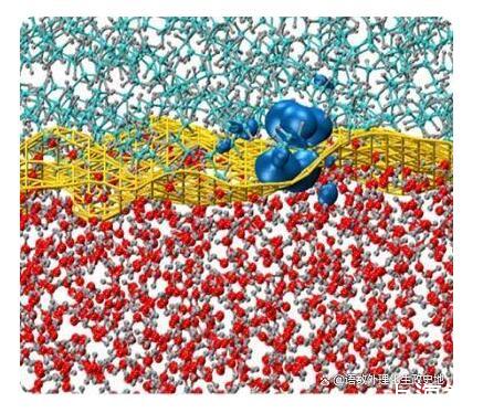 大多數(shù)DFT模擬的計算要求通常與電子數(shù)的立方成比例。但對于具有大帶隙特性的絕緣系統(tǒng),僅線性擴展的DFT技術(shù)可用于研究電子結(jié)構(gòu)。利用這種方法,哈桑納利和他的同事在納米尺度上模擬了由數(shù)千個原子組成的疏水界面的電子效應(yīng)。下圖顯示了模擬的油水界面。